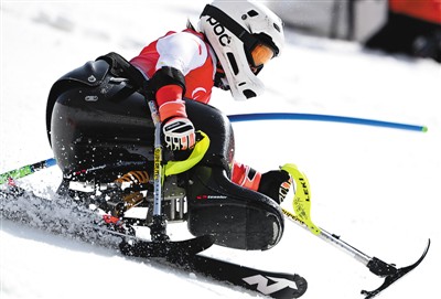 中国选手张雯静在残奥高山滑雪项目女子回转(坐姿)比赛中。新华社记者 李嘉南摄